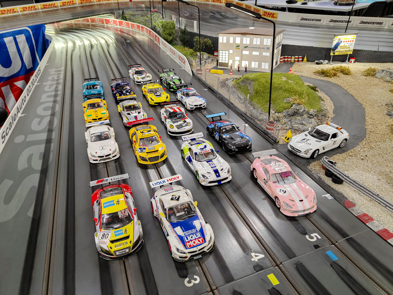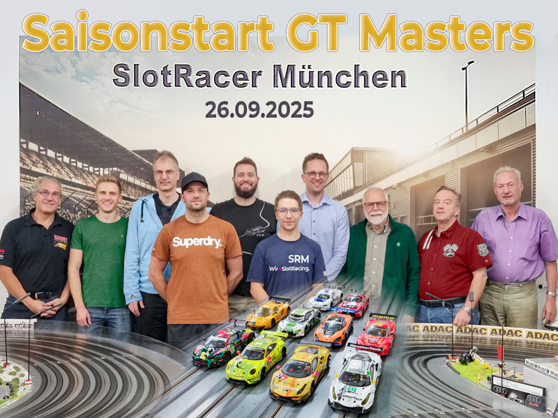 Eröffnung der Rennsaison 2025/26 mit einem GT-Masters Rennen auf unserer neuen Bahn! Zehn Starter in zwei Startgruppen, sieben laaange Minuten auf jeder der fünf Spuren. In den Tagen und Wochen davor wurde schon fleißig trainiert! Und Zuschauer waren auch da zum Anfeuern! Was für ein tolles Gefühl, endlich wieder Rennen! Und was für ein Rennen mit komplett neuem Flow! Tobi Münchberger (Porsche 911) gewinnt souverän mit 2,79 Runden Vorsprung. Um die weiteren Podiumsplätze wird heiß gekämpft. Stefan Limberger fährt mit seinem Audi R8 auf Platz 2 mit nur 0,33 Runden vor dem Nächstplatzierten. Und das ist die Corvette von Alfred Kolb, die nach Rennende sagenhafte zwei Teilstriche weiter rollt als der Ferrari 488 von Maxi Bartsch. Der wird beim nächsten Rennen am 28.11. im letzten Turn bestimmt die Bremse etwas lockern…