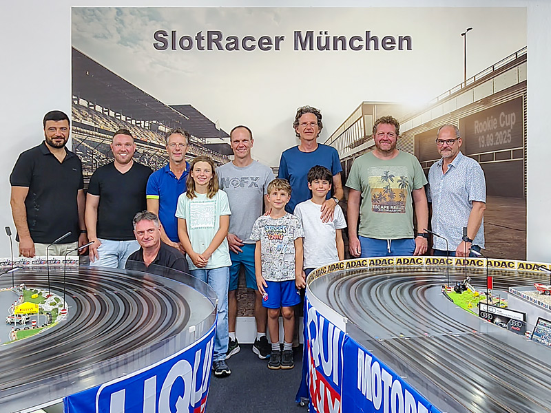 Erstes Rennen auf unserer neuen Bahn! Die Startlampen leuchten wieder, Adrenalin liegt in der Luft, Fahrer und Einsteller sind voll konzentriert. Volles Haus mit drei Startgruppen beim Rookie Cup am Freitag den Dreizehnten! Nomen est omen? Nicht ganz, wir müssen uns auch erst wieder an den Rennbetrieb gewöhnen und waren schnell wieder in medias res. Trainingsrunden, italienische Köstlichkeiten, Qualifying und START-YOUR-ENGINES! Was hat das wieder Spaß gemacht! Die meisten Runden und damit den verdienten Sieg hat sich Valentin Wacht geholt, der sonst auf digitalen Bahnen zu Hause ist. Keine ganze Runde dahinter fährt Marc Pötzsch auf Rang 2. Sein allererstes Rennen neben der Bahn,- sonst IM Porsche auf den großen Strecken unterwegs. Den dritten Platz holt sich Harald Hagner, der noch nie einen Regler in der Hand hatte. Respekt mit nur knapp zwei Runden Rückstand auf Platz 1! Es gab wieder viele nette und interessante Gespräche in der Boxengasse und am Fahrbahnrand und wir freuen uns auf ein Wiedersehen mit Euch allen!